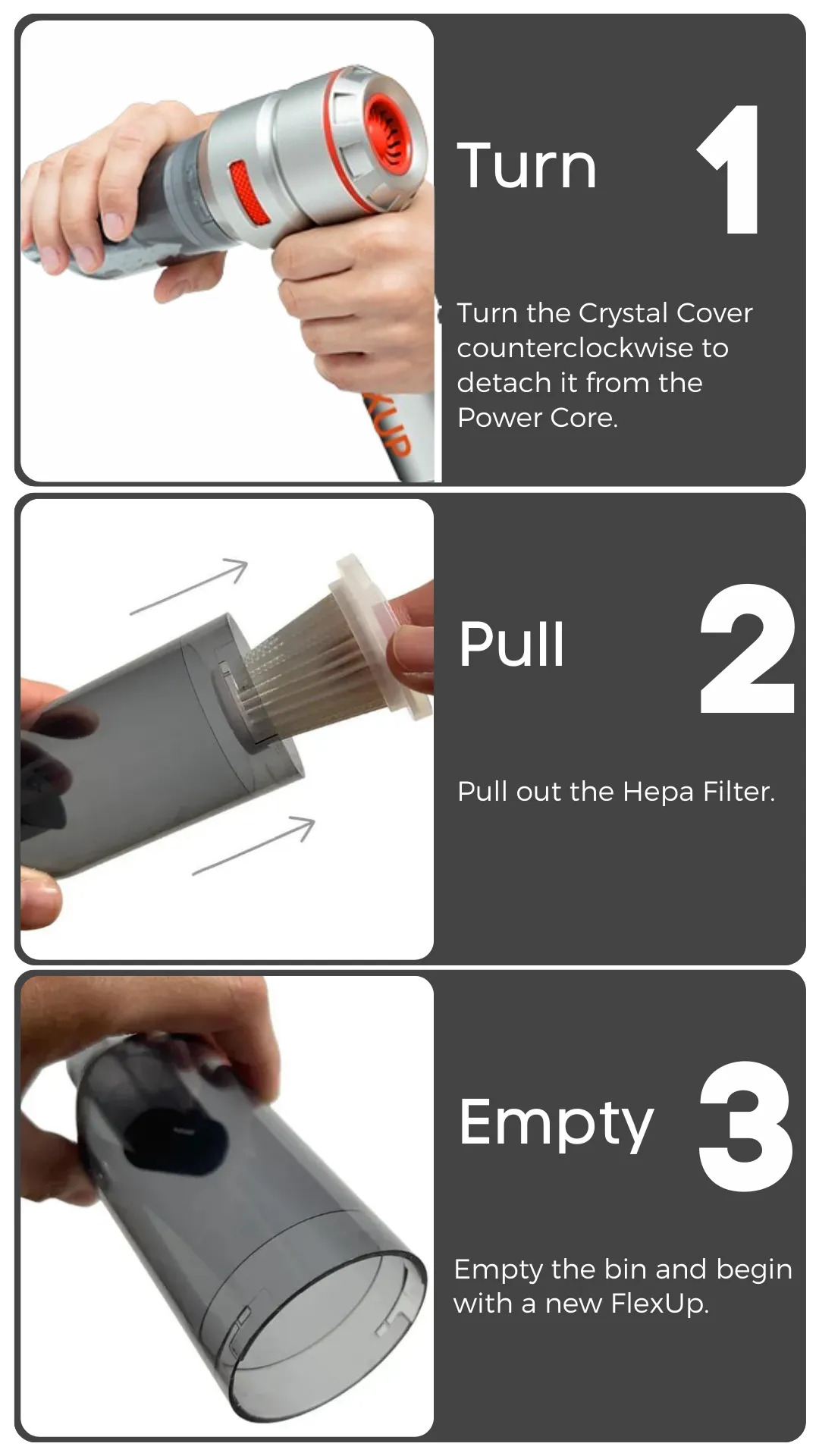 The FlexUp vacuum is easy to clean and maintain. Its removable dustbin and washable filter make it simple to clean out any collected debris or dust.